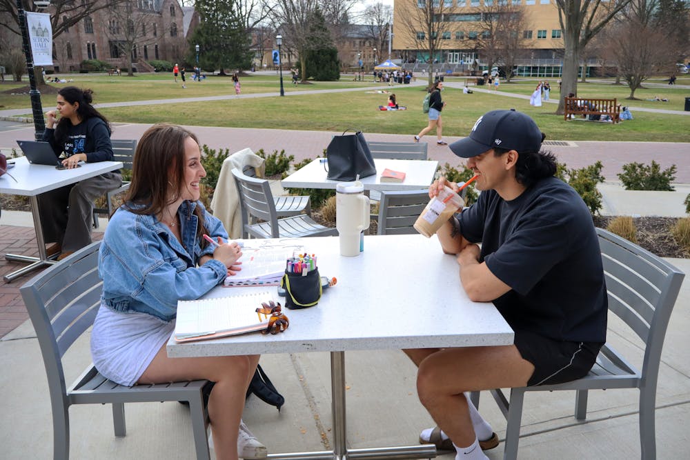 Students enjoying the weather outside on the UC patio | Photo by Benjamin Pendolino | The Setonian